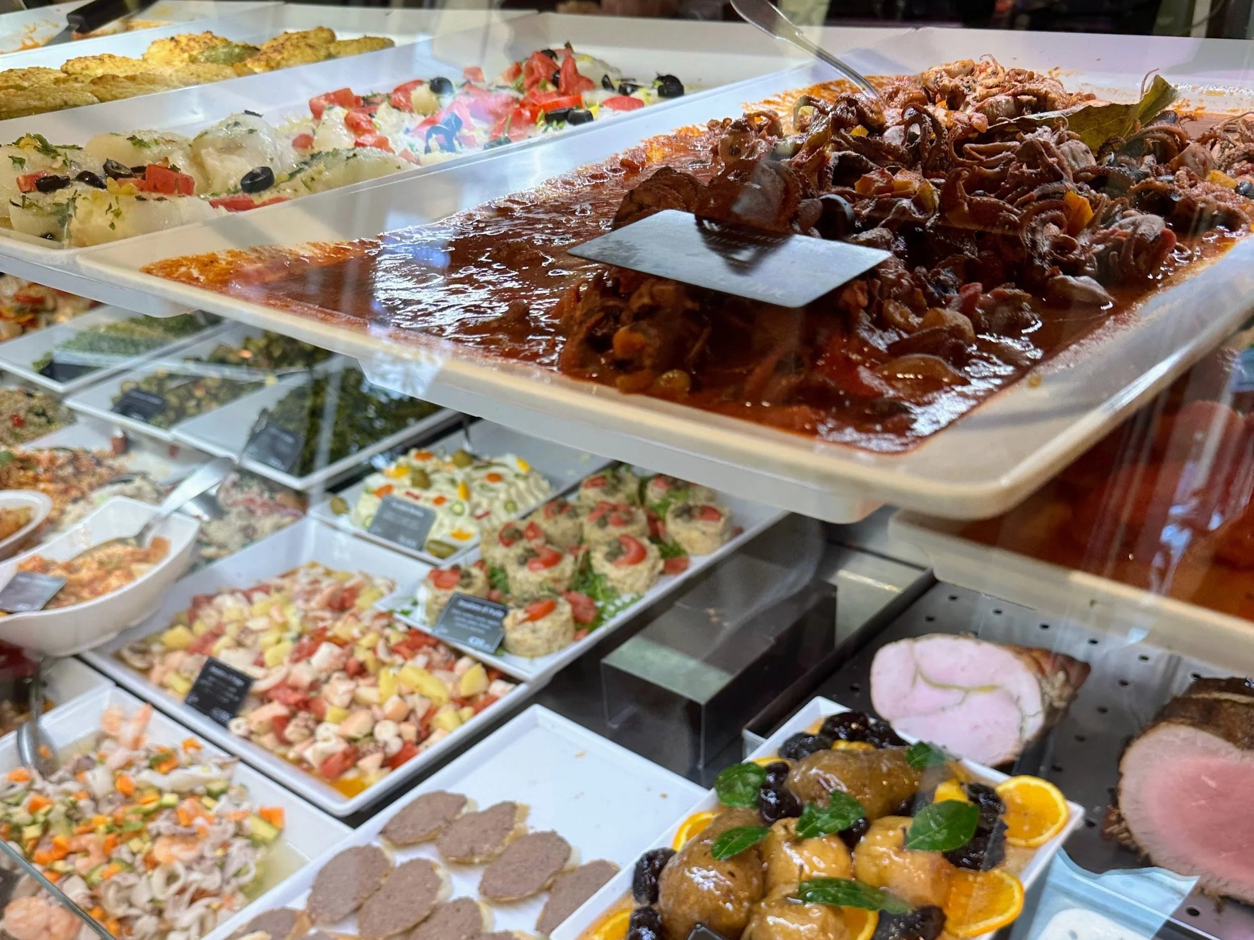 A gastronomia, on the other hand, is broader in scope. Along with prepared dishes, it offers raw and cured products, specialty ingredients, wine, and pantry staples. In short, a rosticceria feeds you now, while a gastronomia feeds you now and later.